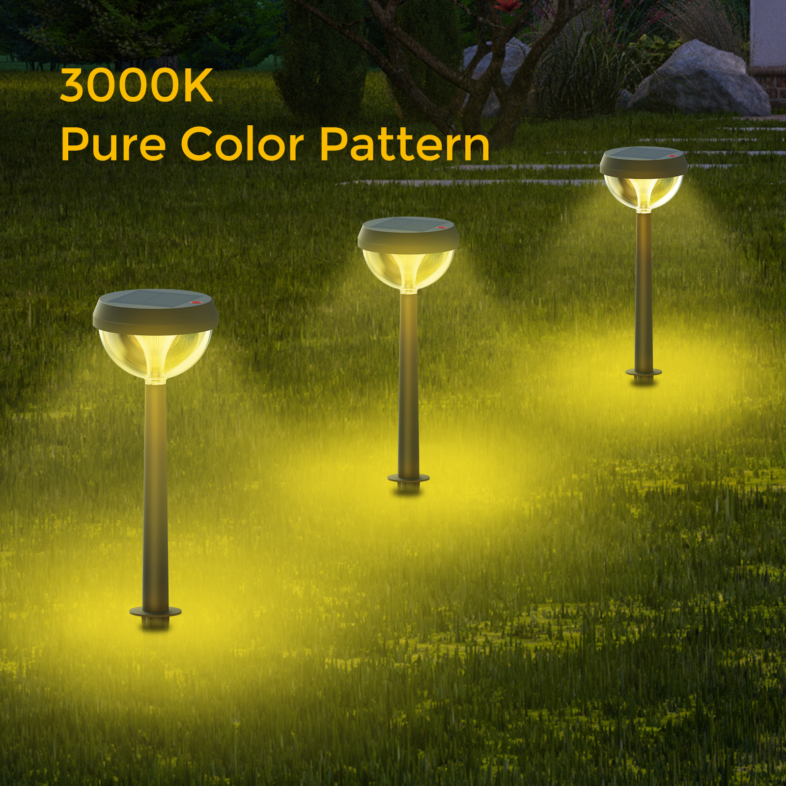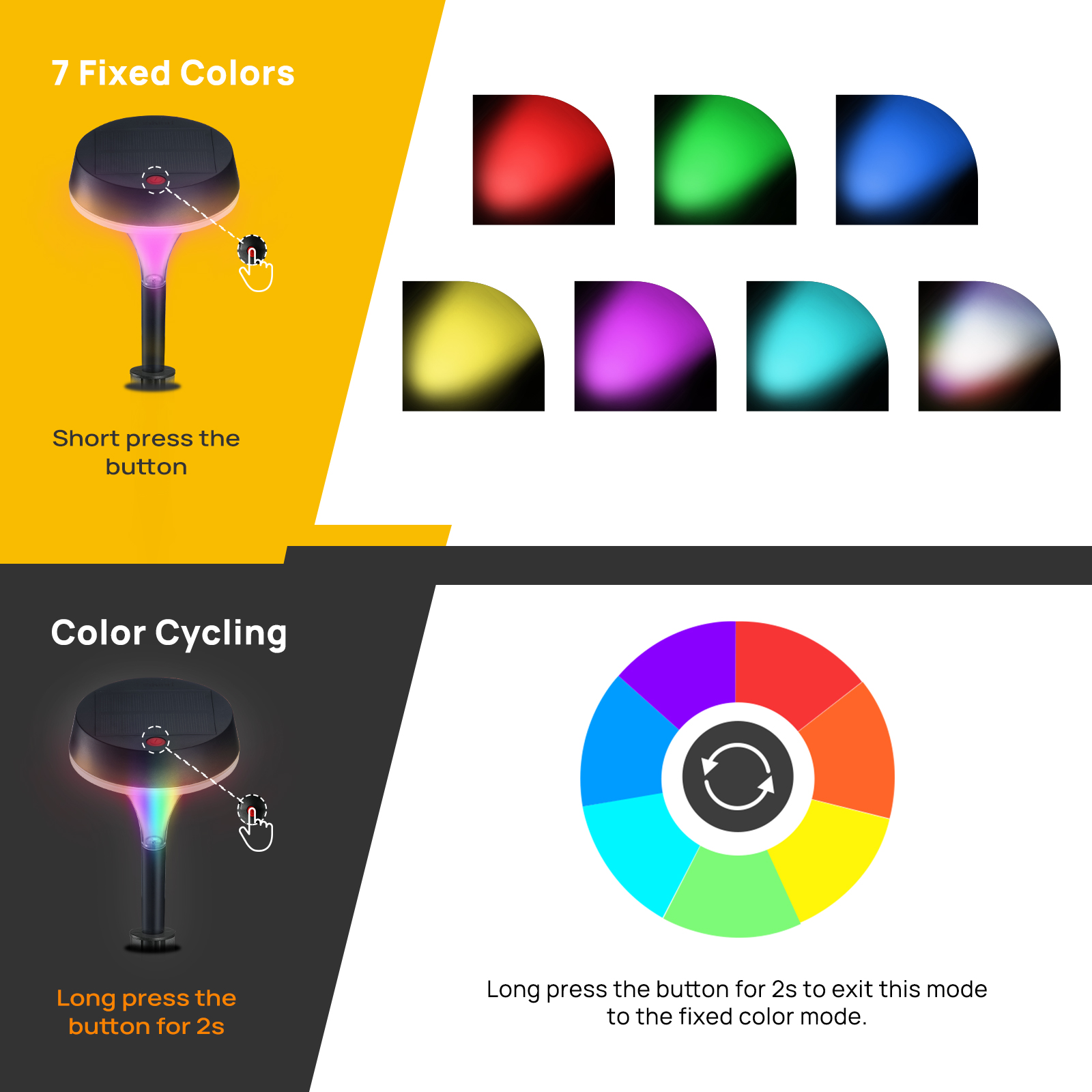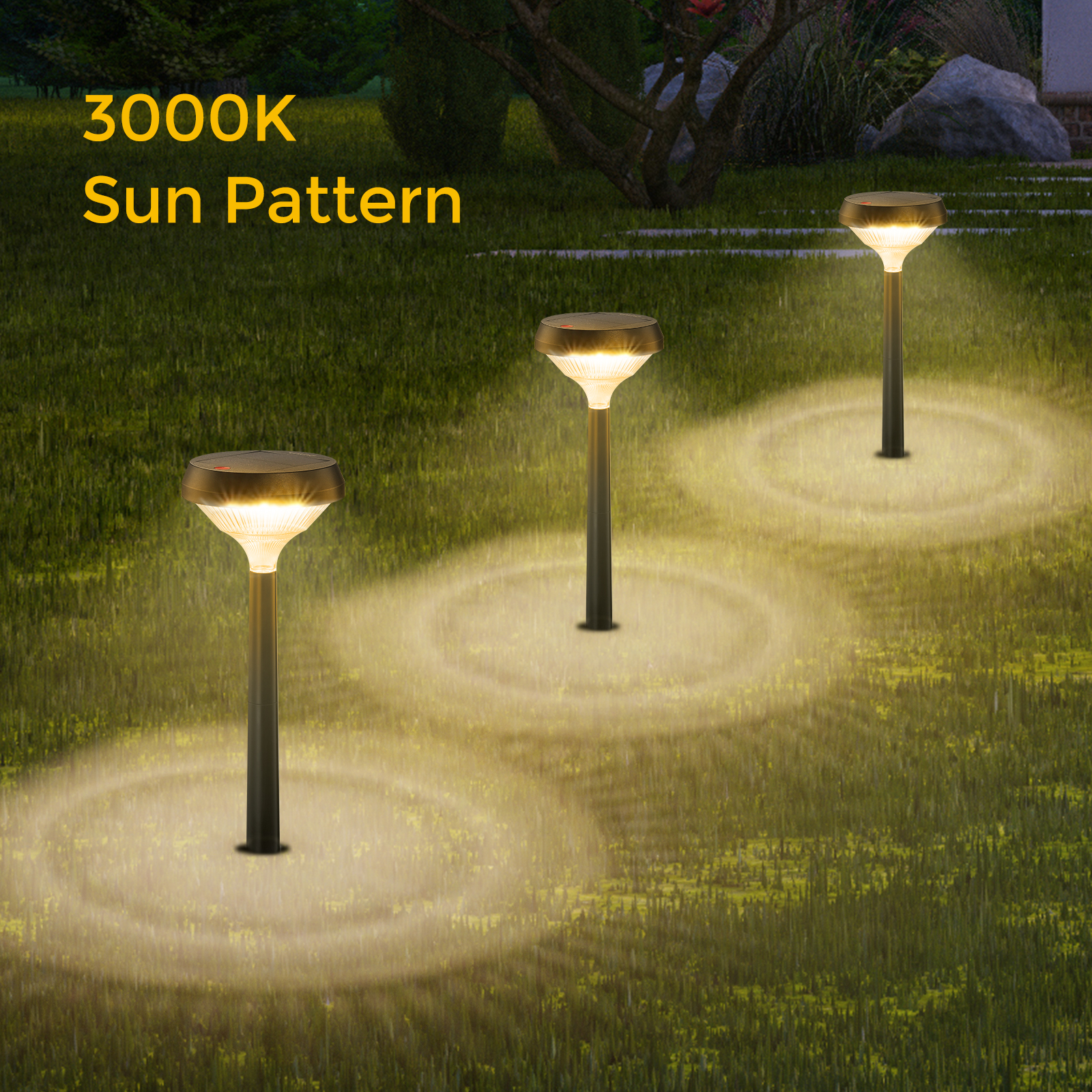 For 3000K solar walkway lights: press to switch between low brightness (12H), high brightness (6H), and breath lighting mode (12H). For RGB solar walkway lights: keep pressing to switch between solid color modes (red, green, blue), mixing color modes (4 colors), and color cycling mode. It is perfect for decorating your garden, landscape, path, yard, patio, riverside.