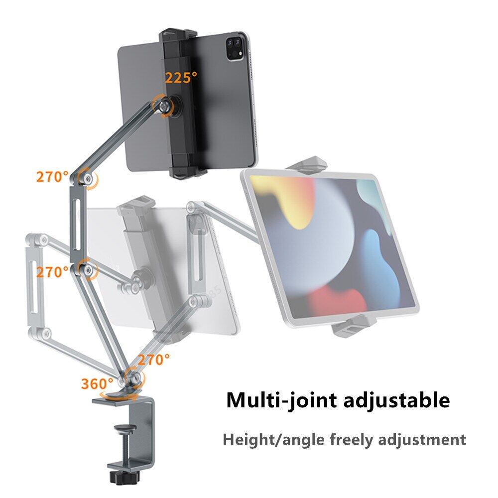 --------------------------------------------------- Ship from Singapore Locally ️ All ready-stock products in Singapore J&T Express Delivery (With Tracking) All Order will be dispatch out with 24Hrs From Monday - Saturday Except for Sunday & Public Holiday --------------------------------------------------- Product Description: 1. Multi-joint adjustable, Height/angle freely adjustment 2. Full aluminium alloy material for base and arm, Match with the MAC surface 3. Max loading 1KG, Stable without shaking 4. 360° rotation screw structure base, Support clamping desk thickness 0-64mm 5. Wide compatibility, Fit for Cell phones and tablet pc from 4 inches to 13 inches. Product Specification: Material: Aluminium Alloy and Silicone Gel Product Colour: Grey/Silver Product Size: 65.8 x 16.6 x 6.6cm Product Weight: 0.47 kg What's in the package? - 1x Holder Clamp 3 Months Local Warranty *Terms and conditions applied *