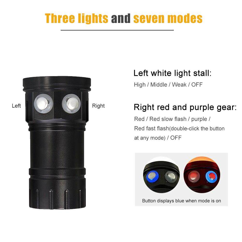 Red and purple light switch Mode (the right power key): Red / Red slow flash / purple / Red fast flash (double-click the button at any mode) / OFF (Long press the button for 2 seconds at any mode)