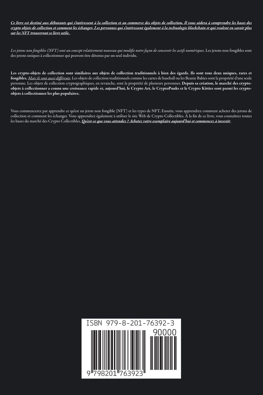 Vous commencerez par apprendre ce qu'est un jeton non fongible (NFT) et les types de NFT. Ensuite, vous apprendrez comment acheter des jetons de collection et comment les échanger. Vous apprendrez également à utiliser le site Web de Crypto Collectibles. À la fin de ce livre, vous connaîtrez toutes les bases du marché des Crypto Collectibles, Qu'est-ce que vous attendez ? Achetez votre exemplaire aujourd'hui et commencez à investir